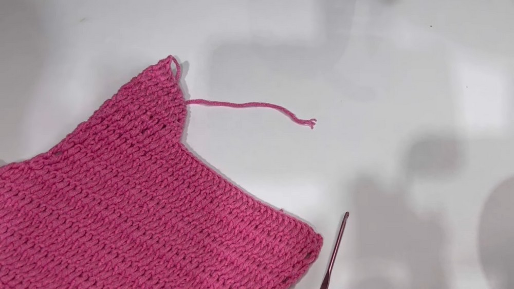 - Work 4 rows on each armhole side (both sides). Each row ends with decreases similar to previous pattern (skip 1 stitch at start, work dc till last 2 stitches, then decrease).