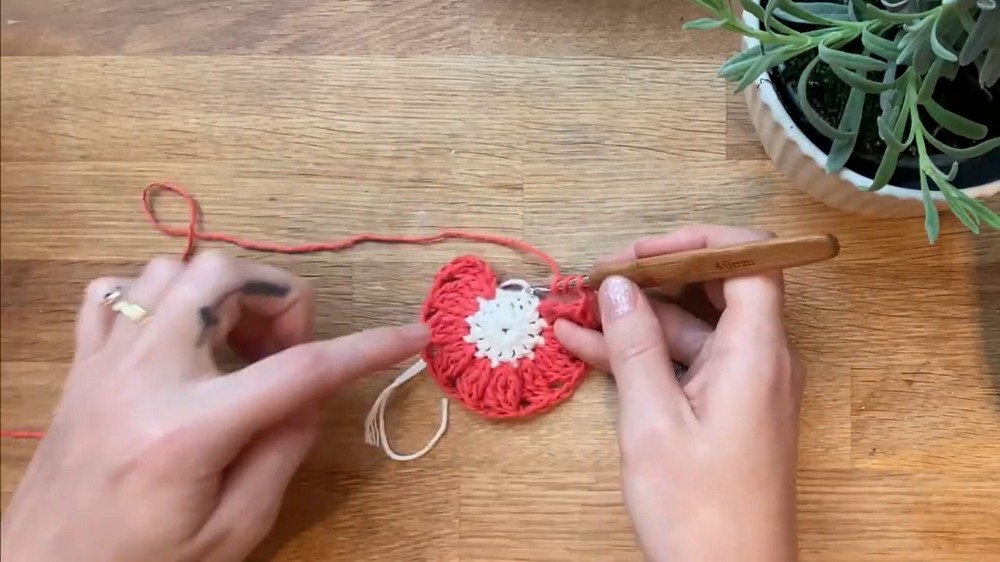 - Continue this pattern around the circle to create 12 petals, separated by chain 2.