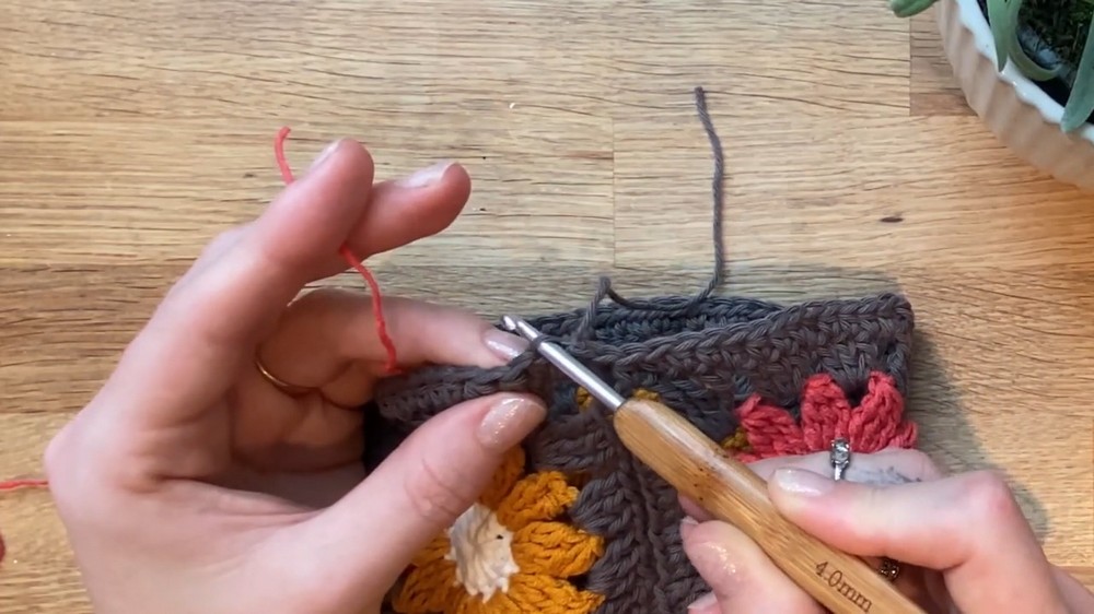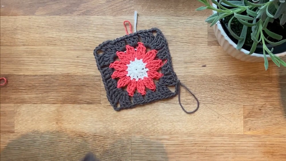 - Fasten off and attach a yarn color of your choice to create the square outline.