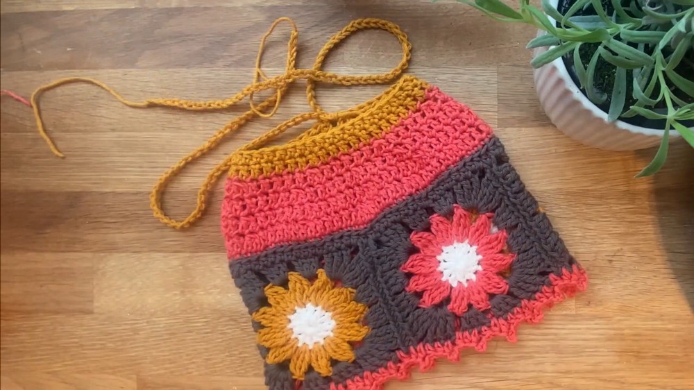 - Fasten off and weave the tie through the bottom row of stitches. Repeat on the opposite side for the second tie.