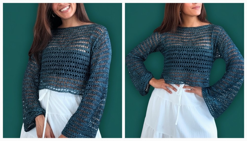 It’s a perfect piece for summer evenings or layering during cooler months. You can customize the size to fit perfectly by adjusting the starting chains or adding extra rows. The sweater is made by creating two rectangles (front and back panels) and sewing them together, leaving space for the neck and arms.