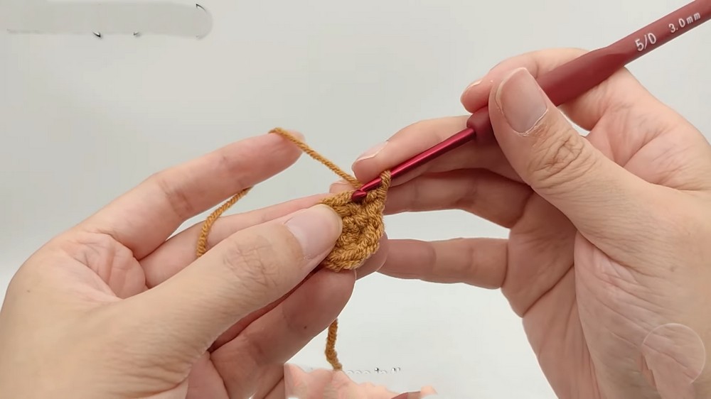 - Tighten the ring and join with a sl st into the first sc. (5 sts)