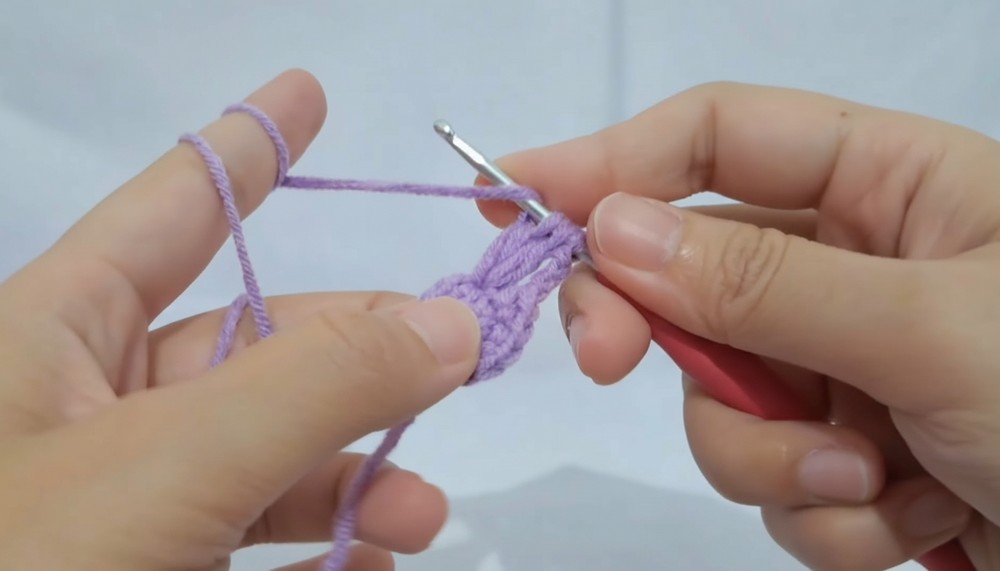 - Wrap yarn around fingers to form a loop, secure with a chain.