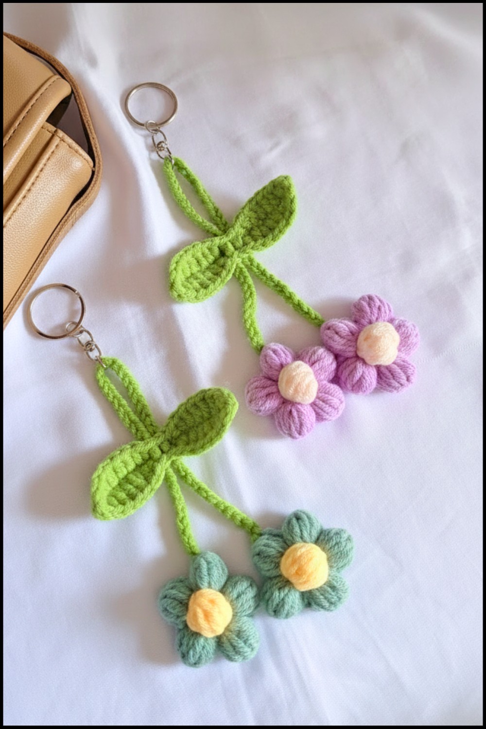 The size of the flower keychain will depend on the yarn weight and hook size. The design creates a compact, puffed flower ideal for keychain use.