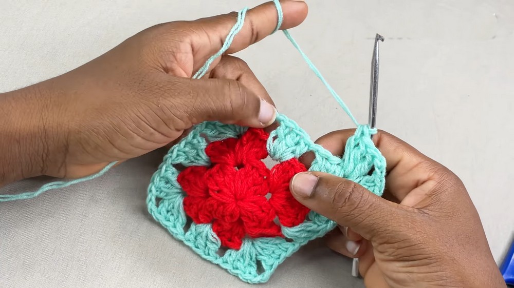 - Into the same corner space, crochet 3 double crochets, chain 2, and 3 double crochets again.