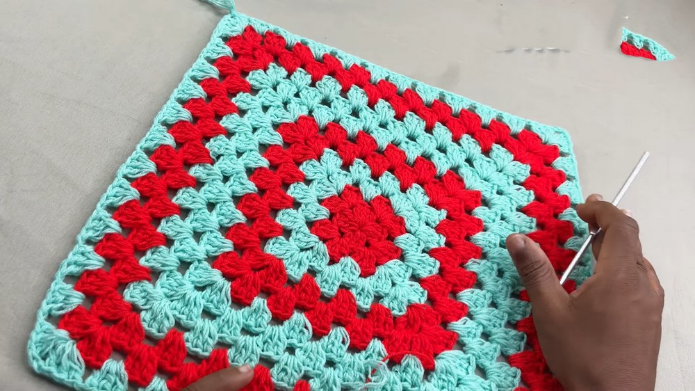 - Repeat this process until the entire square is expanded into 6 double crochet clusters for each corner.