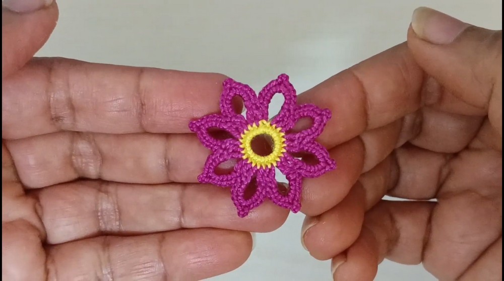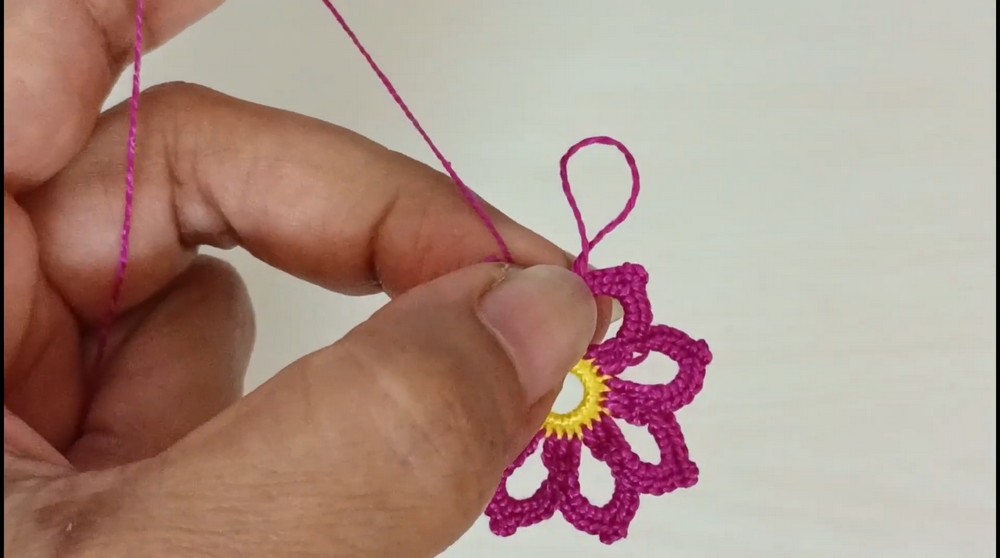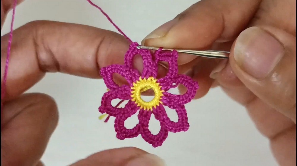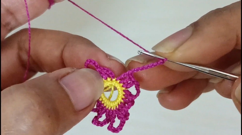 2. Once the round is complete, secure the thread by making a slip stitch into the second double crochet stitch in the middle of each petal.