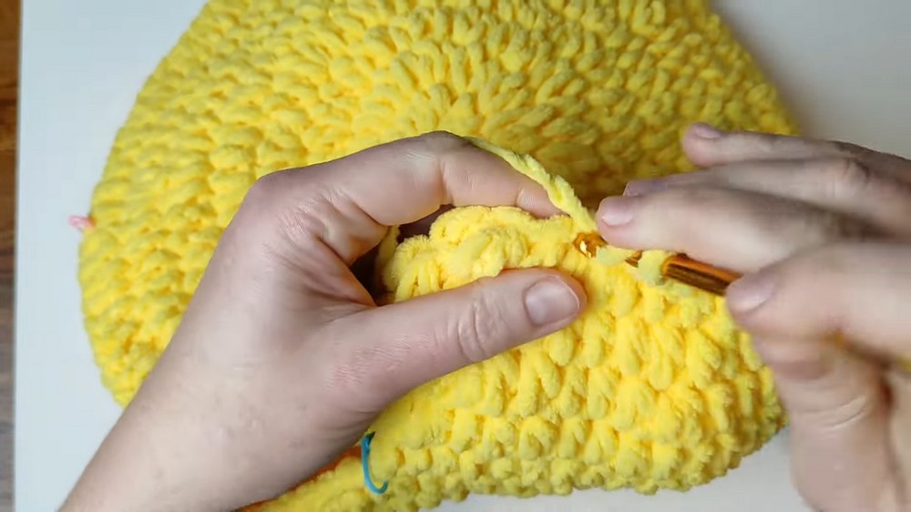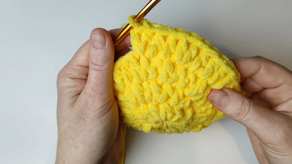 - Row 3: Work 17 HDCs, followed by 1 HDC decrease. Repeat on both sides of the point.