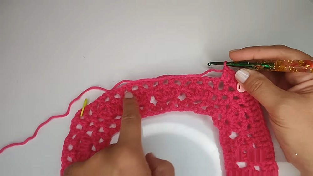 - Row 1: Work a row of V-stitches as described in the Round 1 Yoke instructions.