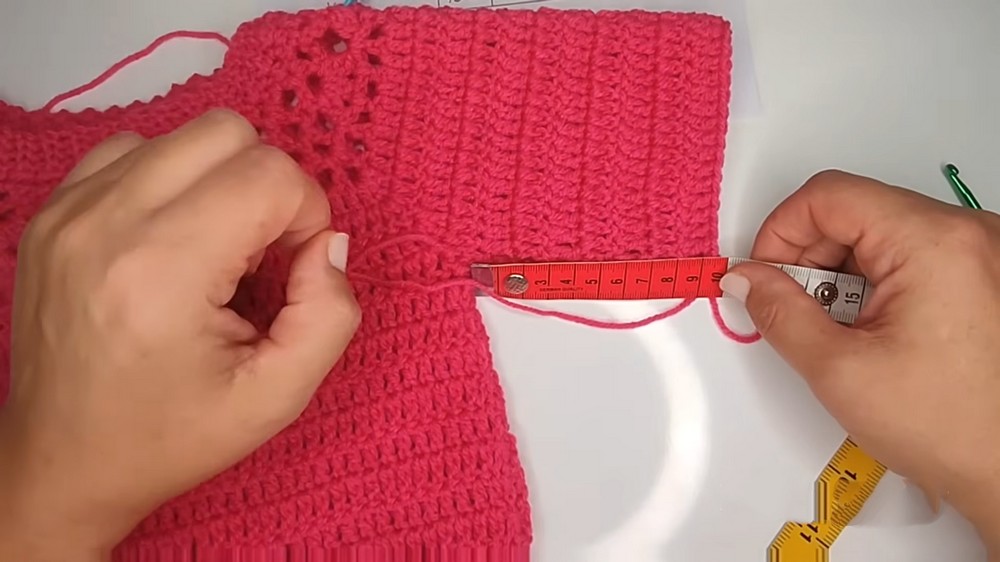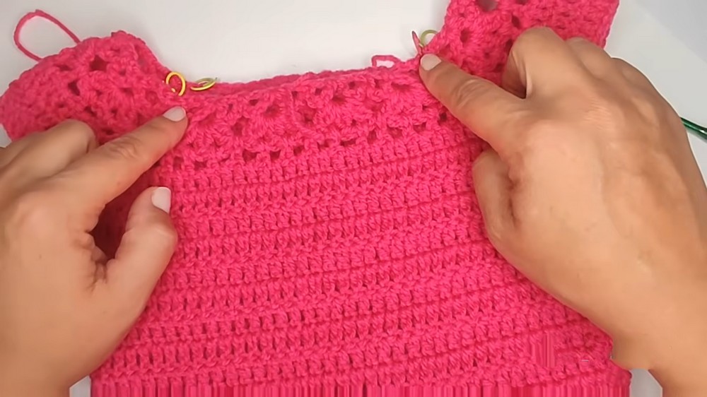 - Example: For the 6-9 month size, ch 1 between stitch markers on the sides to form armholes. Adjust the number of chains slightly if the chest is tight or needs extra room.