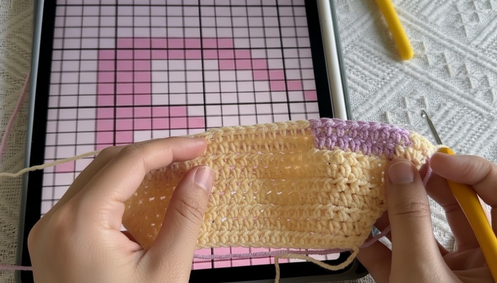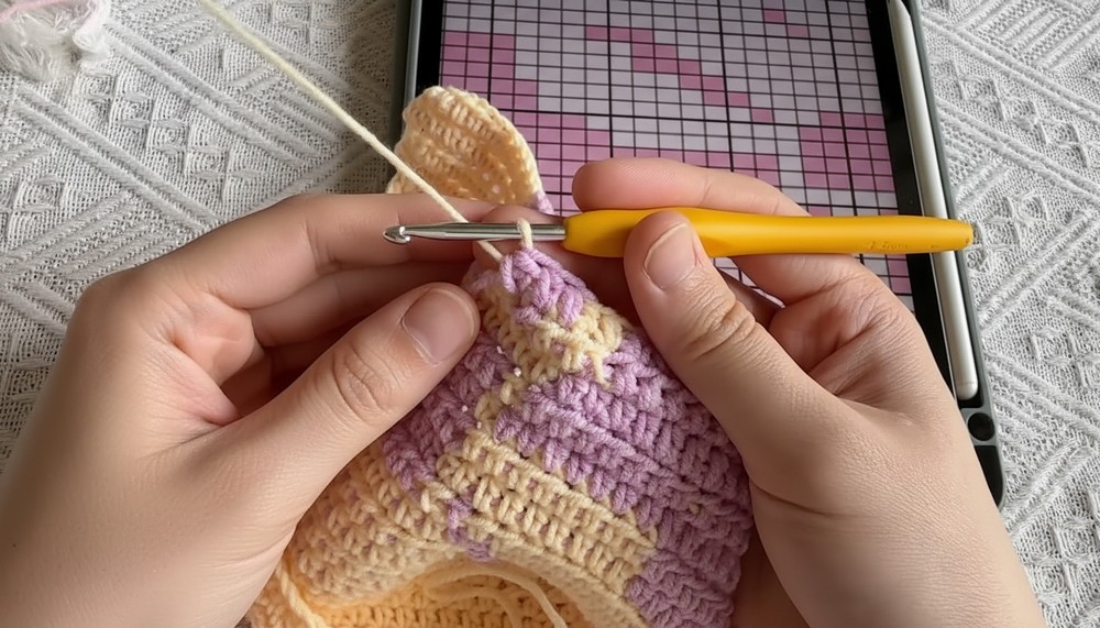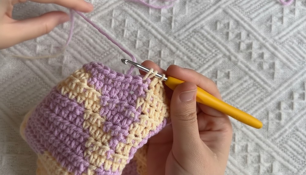 - Use dual strands of yarn (e.g., Purple and Yellow) for added structure.