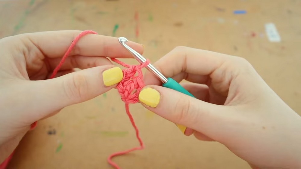 • Yarn over, pull through 2 loops; yarn over, pull through the final 2 loops. (This is a DC stitch).