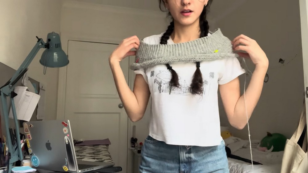 - Try on the ribbing occasionally to check fit around shoulders (shouldn’t be too tight or loose).