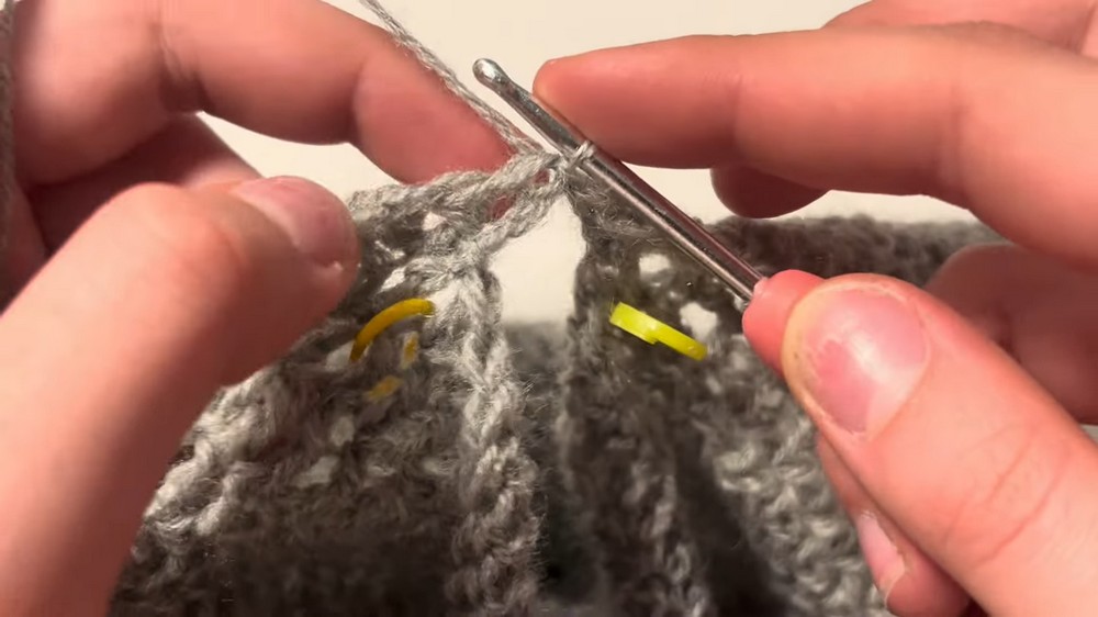 - Work normal dc stitches between front and back stitch markers for the body panel.