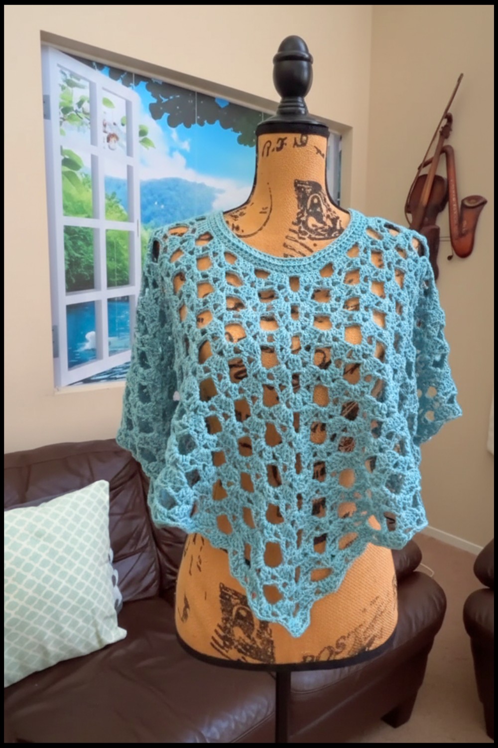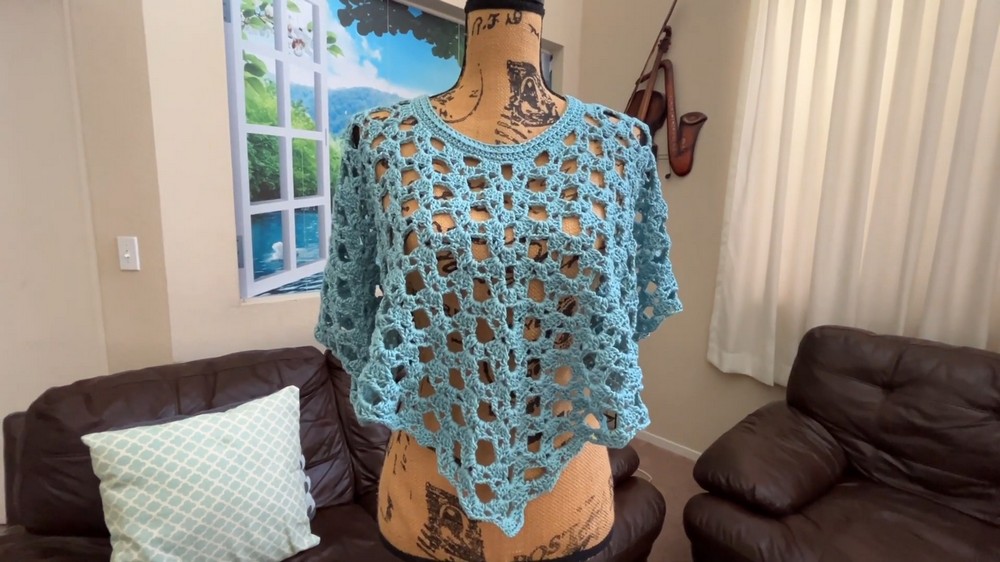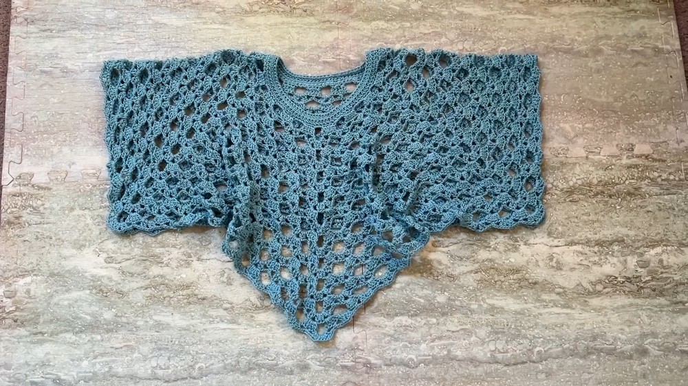 The design starts at the neck and grows into a unique pentagon shape with five sides and five corners. It's made by working simple crochet rounds until you reach the length you like. After that, the sides are joined to create openings for the arms and waist.