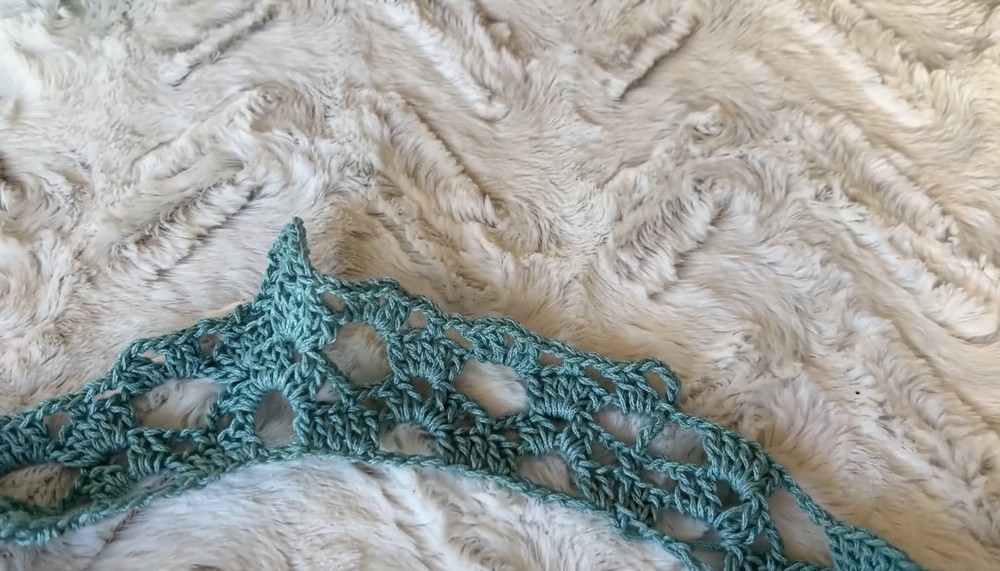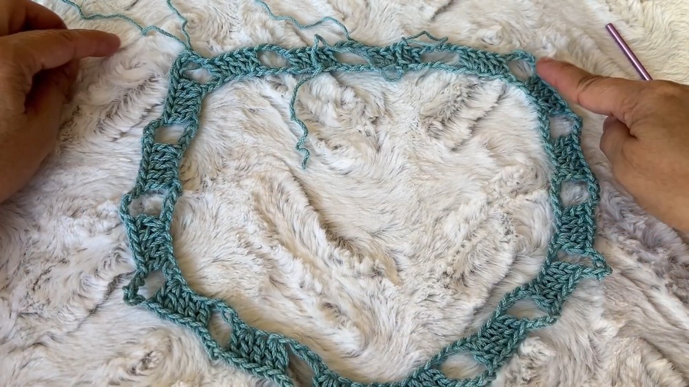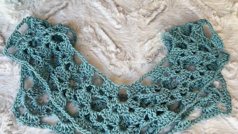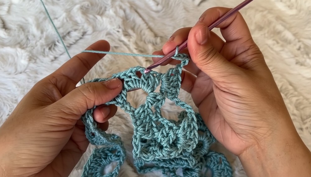 - Continue the pattern: Shell, chain 2, skip 2 stitches.