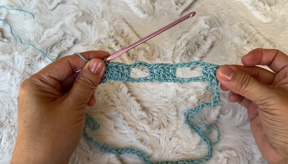 - Chain 2, skip 2 stitches, and single crochet in the next stitch.