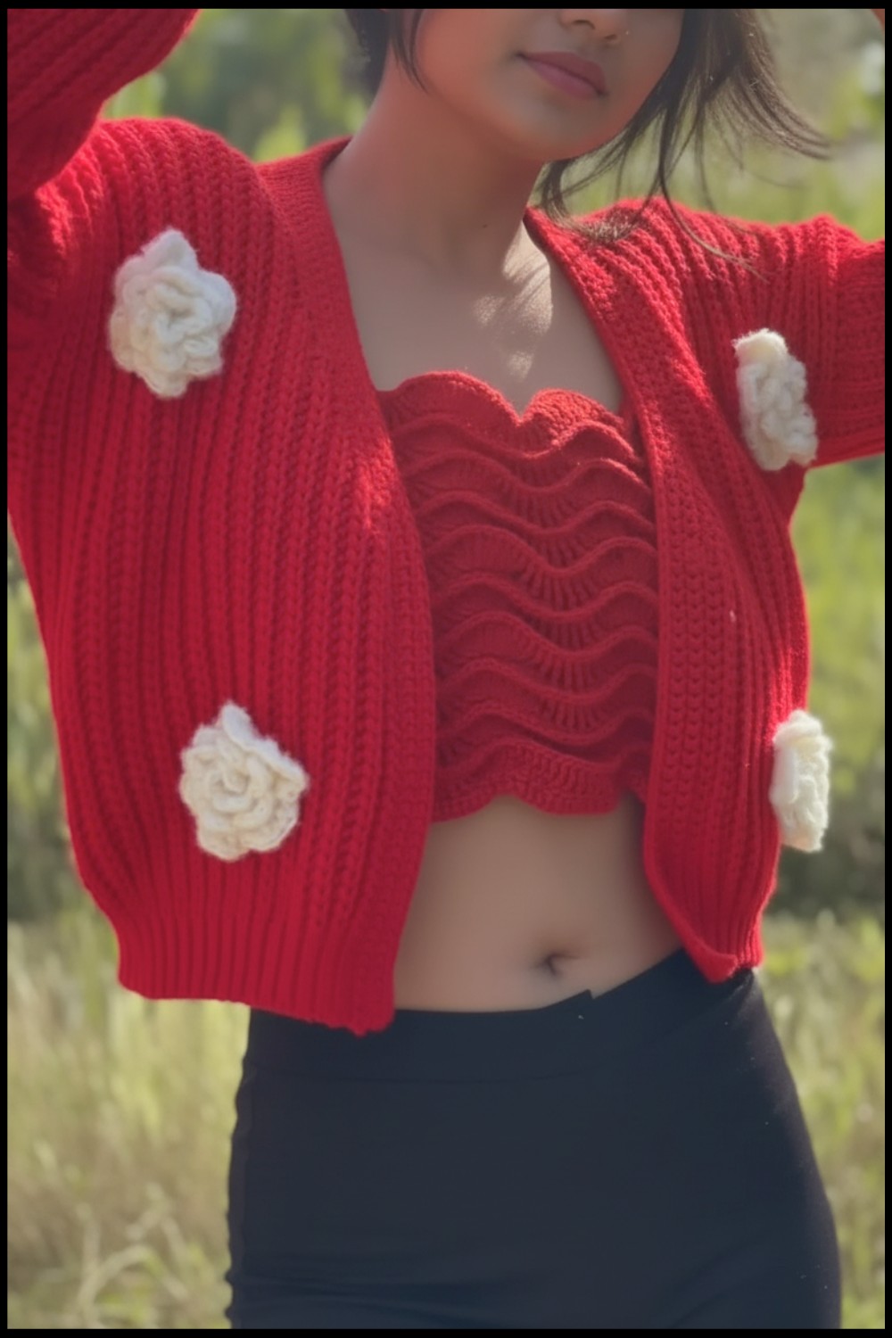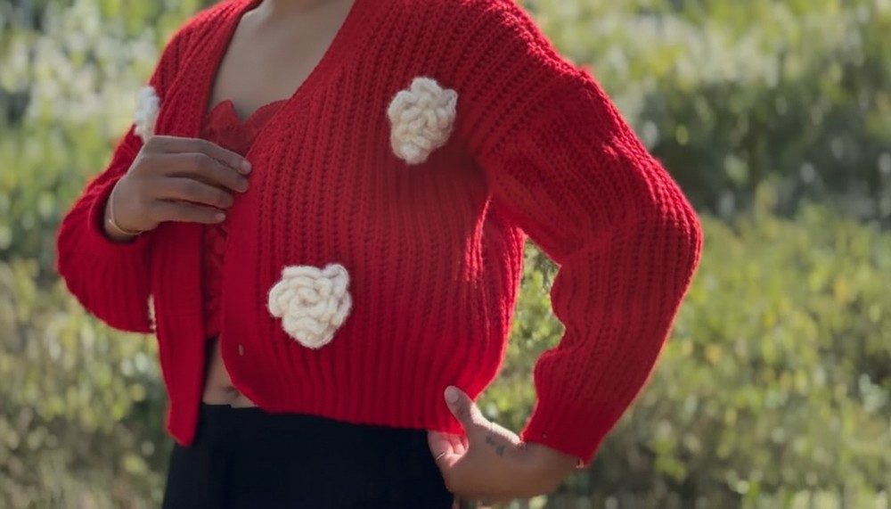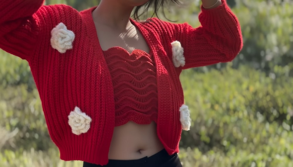 Optional flowers or embellishments can be sewn onto the cardigan for added flair.