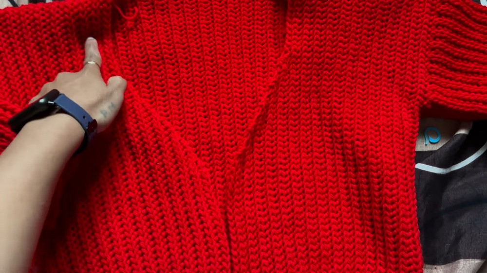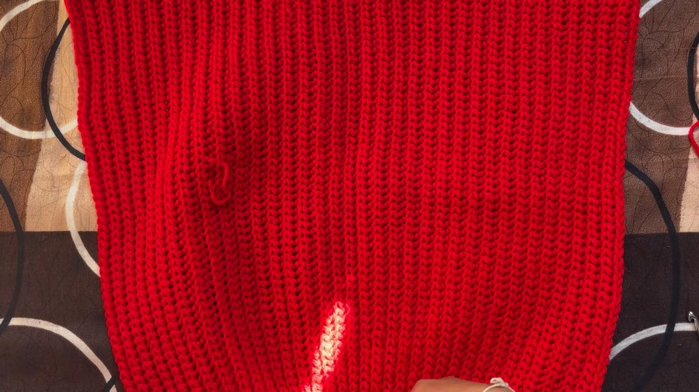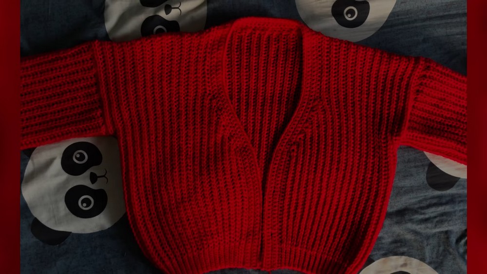 - Attach yarn to the bottom corners of the cardigan with 4.5mm hook.