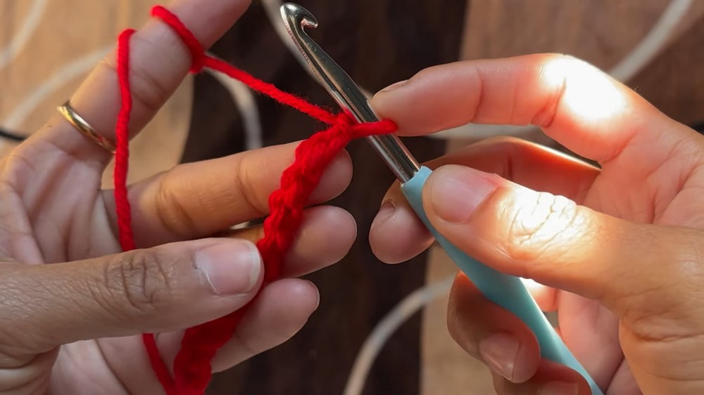 - Yarn over and insert the hook into the back loop of the second chain from your hook.
