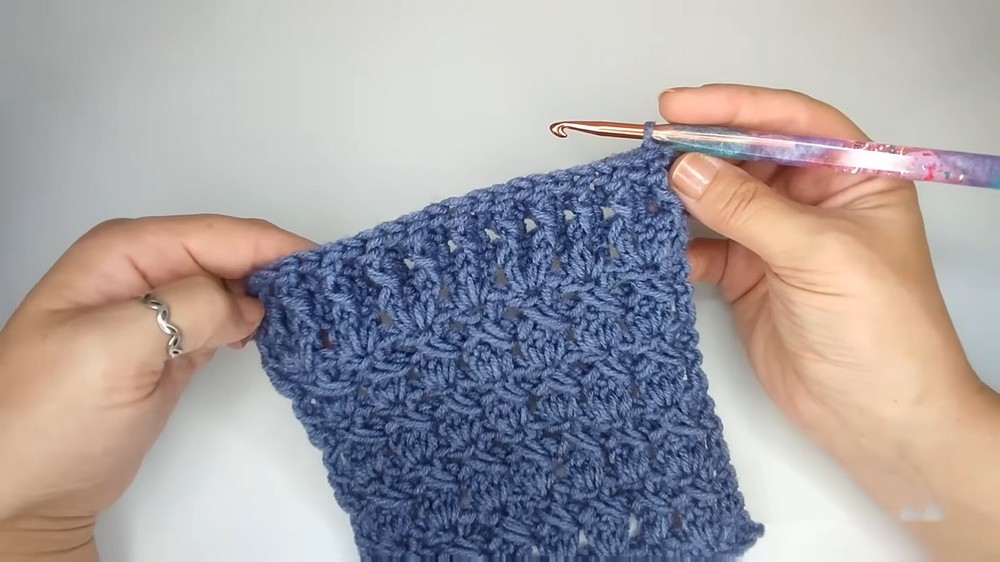 - Work cross stitches: Yarn over behind 3 double crochet stitches, pull the yarn up, and chain one.