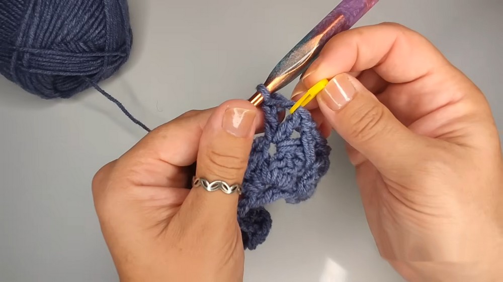 - Work 3 double crochet stitches into each loop until you reach a stitch marker.