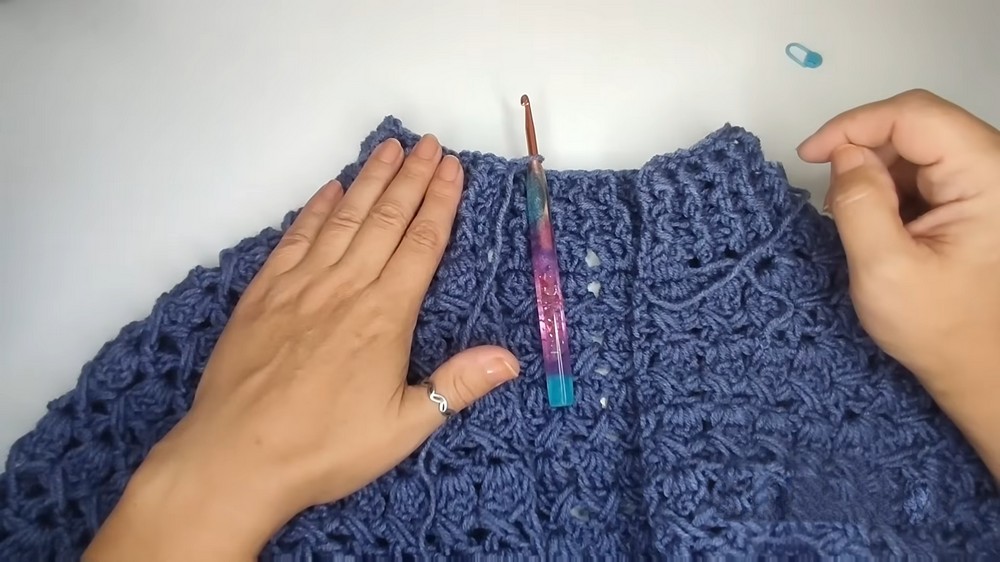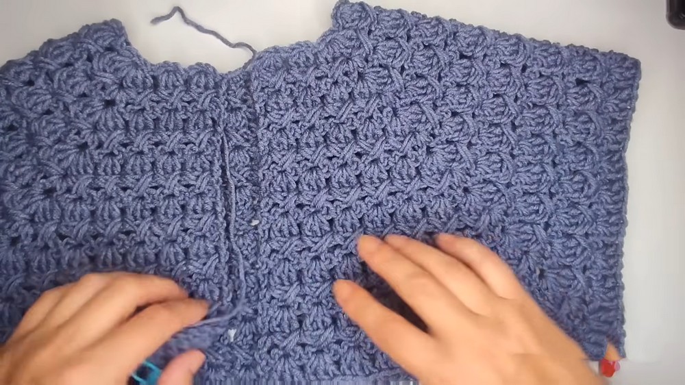 - Work a slip stitch through the chain spaces marked for armholes. This removes excess width and creates clean connections.