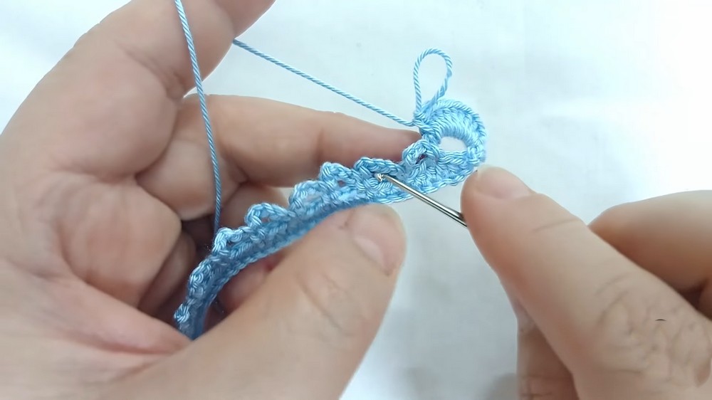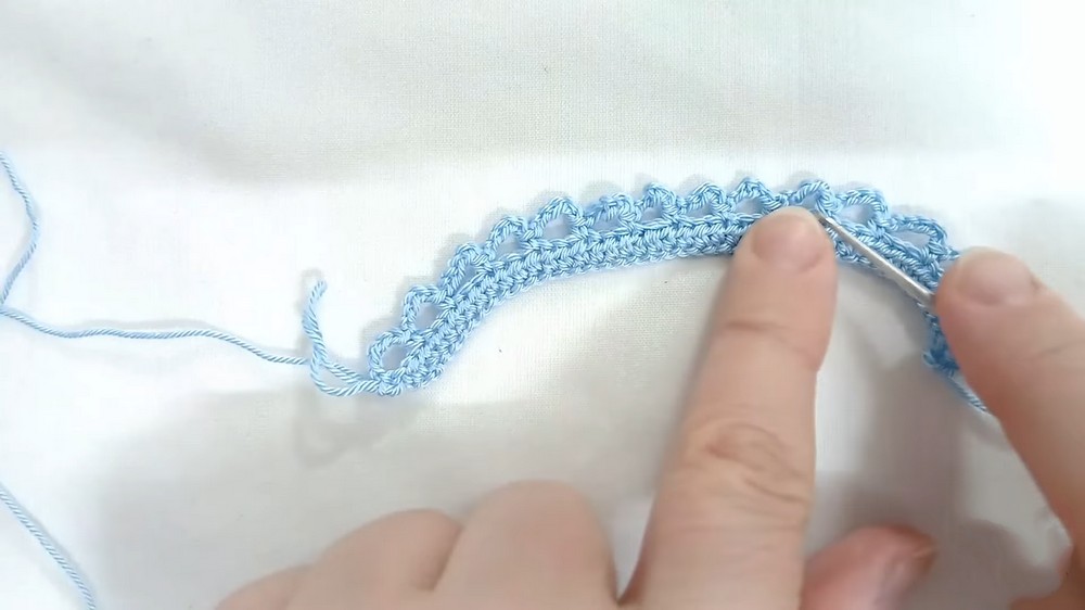 • In the first hollow space: 1 sc, 9 dc, 1 sc.