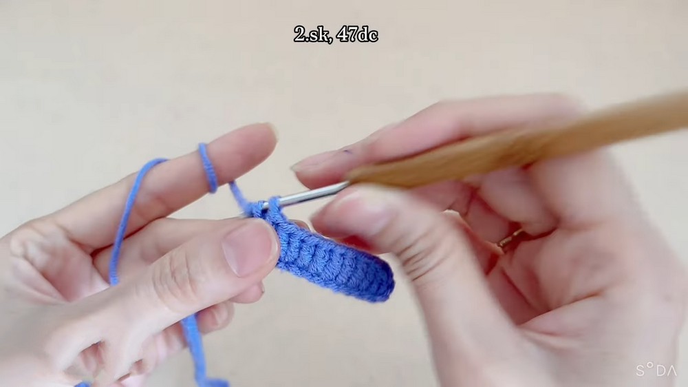 - Continue crocheting 1 double crochet (DC) in each chain stitch until you reach the end of the row. You’ll have a total of 47 double crochets.