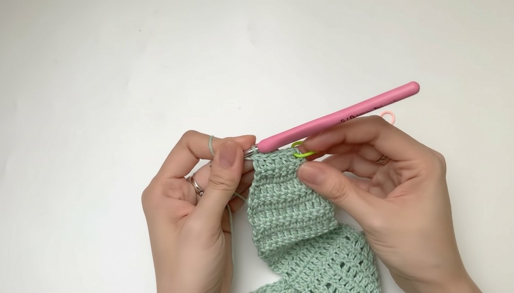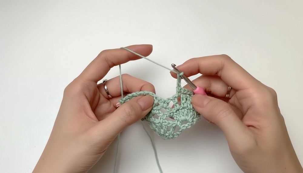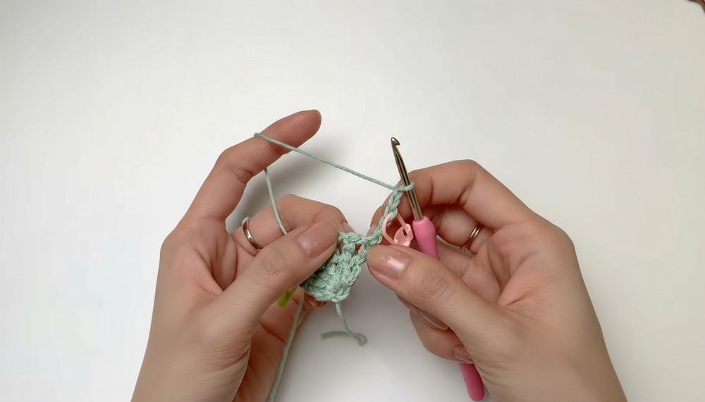 • Chain 4 (creating a chain space), skip the next stitch, sc in next stitch.