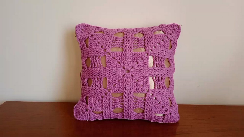 • Lay the completed crochet square over the cushion insert or fabric cover.