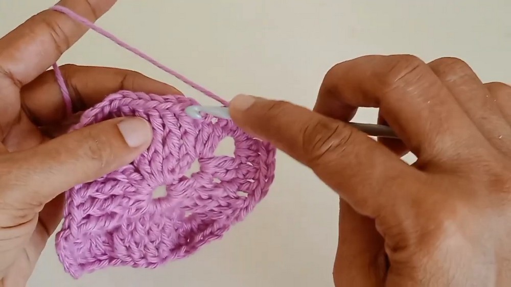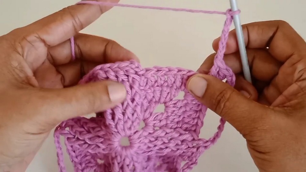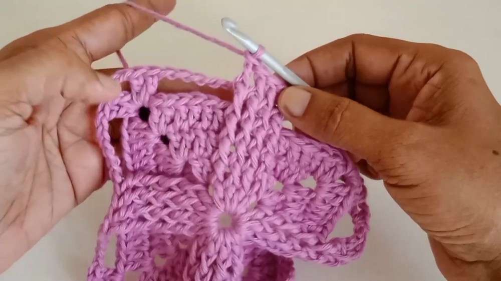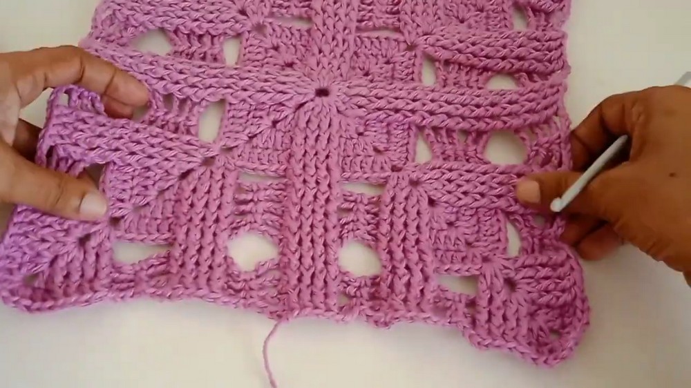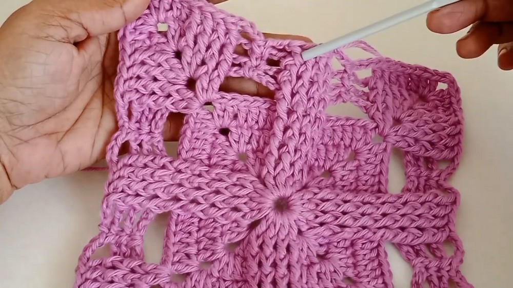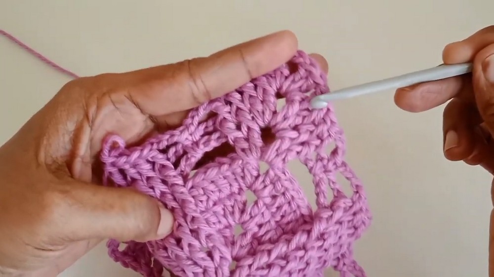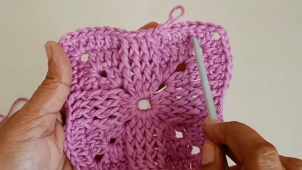 • Corners are formed by adding 2 double crochets, chain 2, and 2 more double crochets within the corner spaces.