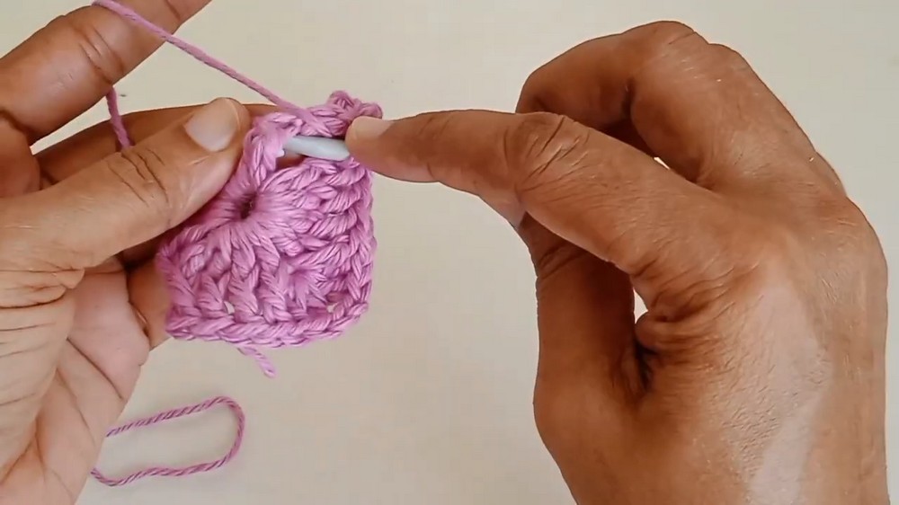 3. To form a corner: Chain 2, then work 4 double crochets (dc) into the next set. Repeat the 4 front post double crochets along each side.