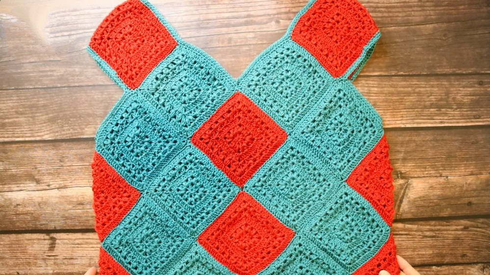 - Position 2 rows of additional granny squares directly below the neckline diamond to form the body of the vest.