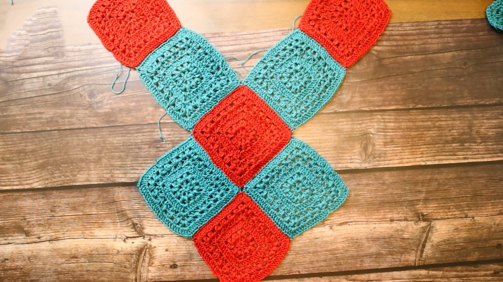 - Continue joining all the required squares for the neckline, body, and sides according to the layout.