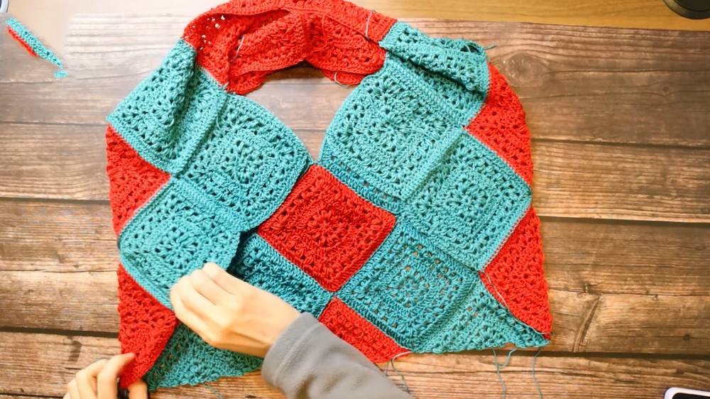 - Attach additional squares around the neckline to fit your size. For a lower neckline, use more squares.