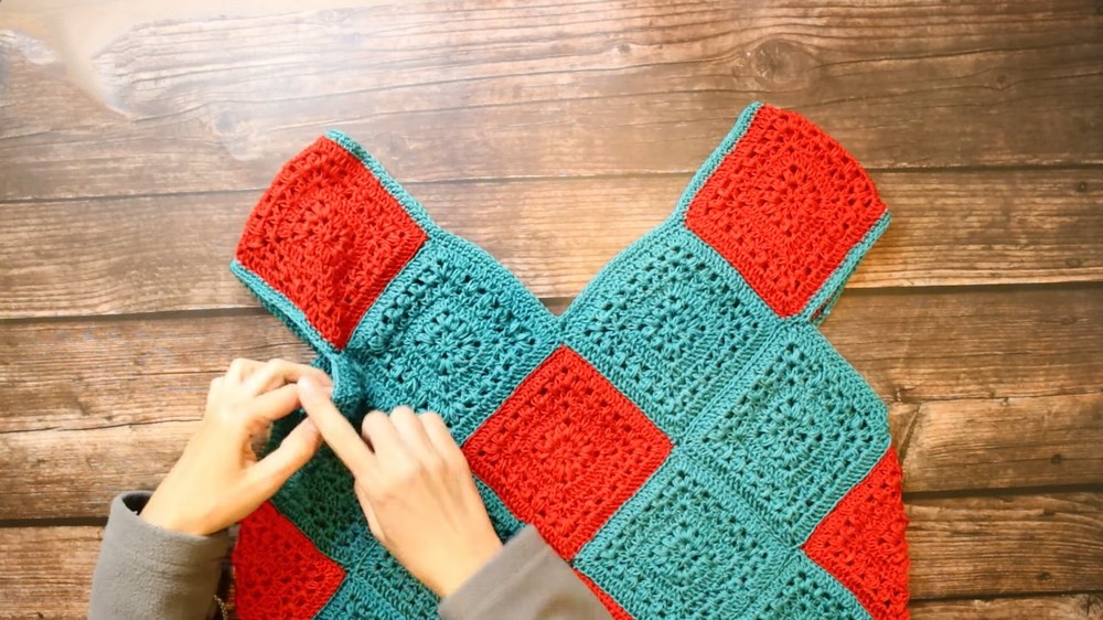 - For the side seams, attach additional squares vertically on each side, extending from the bottom edge up to the armholes.