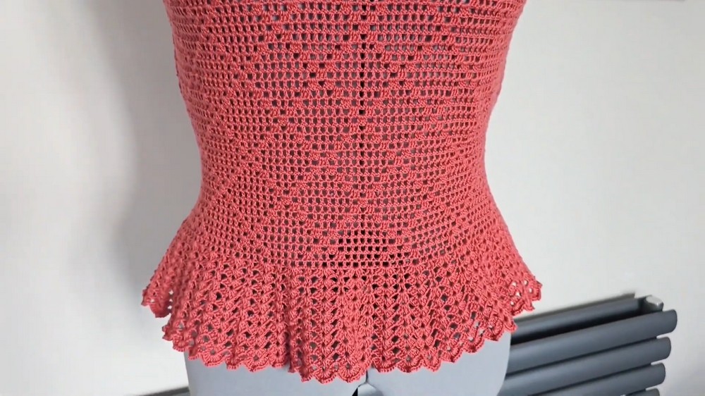 You have successfully crocheted a beautiful, versatile top with a delicate pattern and elegant shape. This top combines simple stitches and smart increases for a flattering fit and stylish ruffle hem. Perfect for warm weather, it can be adjusted easily for size or length. Enjoy crafting and wearing your handmade garment!