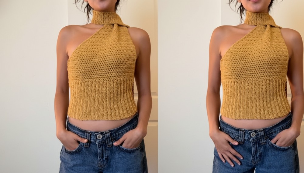 This free crochet pattern guides you to create a unique asymmetrical turtleneck top that wraps beautifully around your neck, adding comfort and elegance to any outfit. The design is simple and modern, featuring a ribbed texture for the torso and a snug neckline strap.