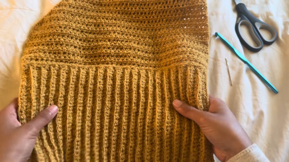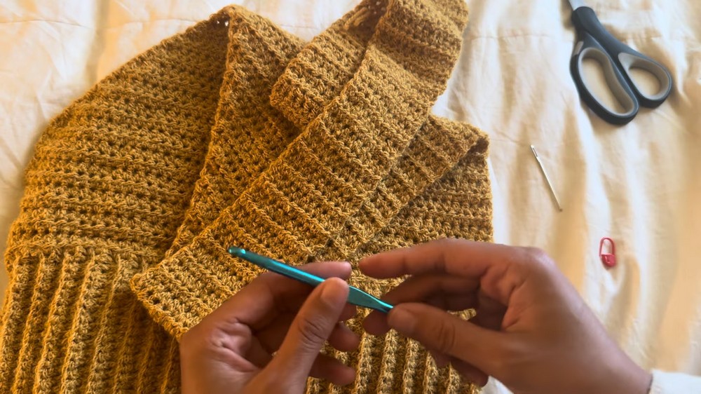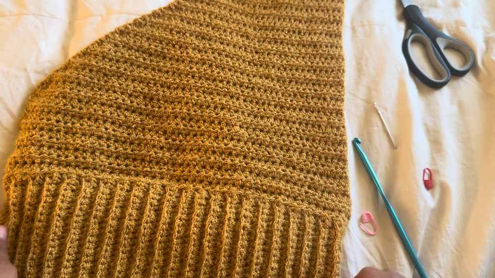 - Work approximately 10–15 rows of hdc across (or until the panel fully covers the bust area).