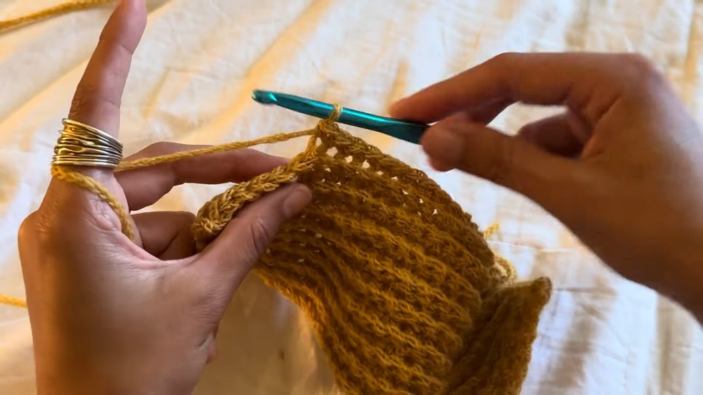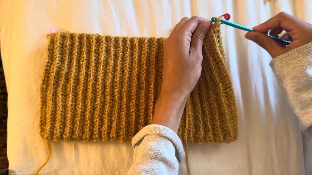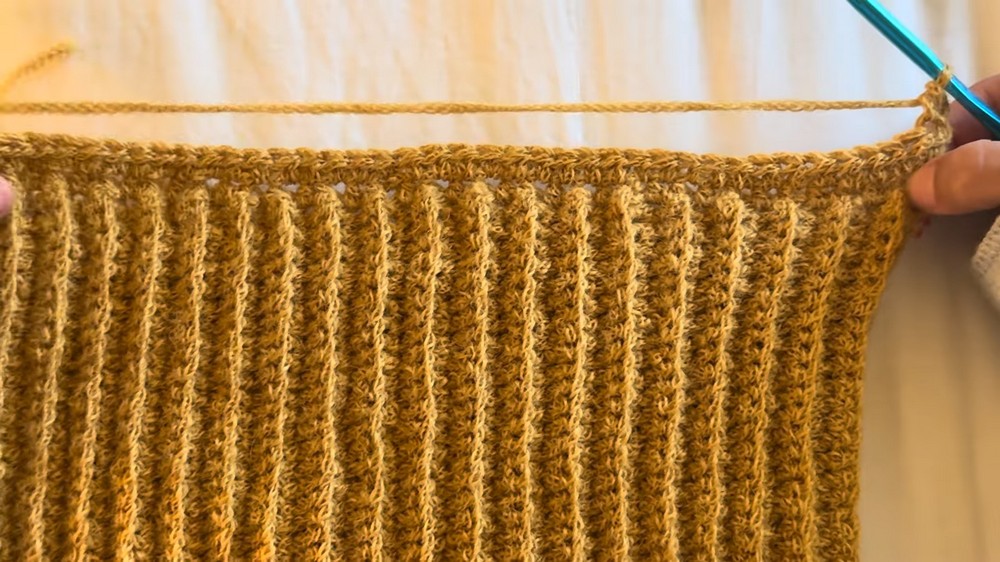 - Work 30 single crochets into the back loop only (BLO) of each stitch across.