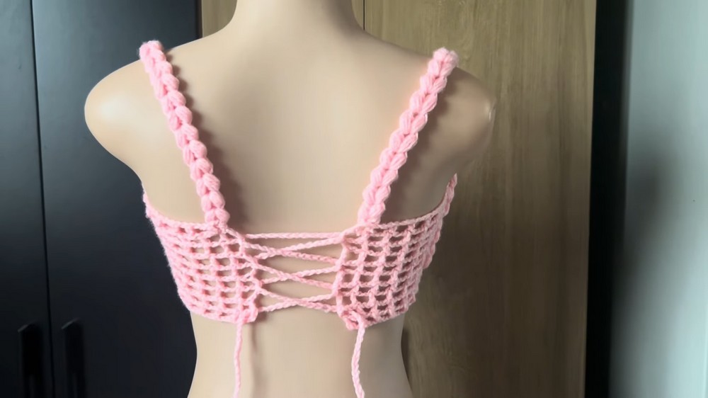 • Mesh Crochet: Openwork stitch pattern for the back straps.