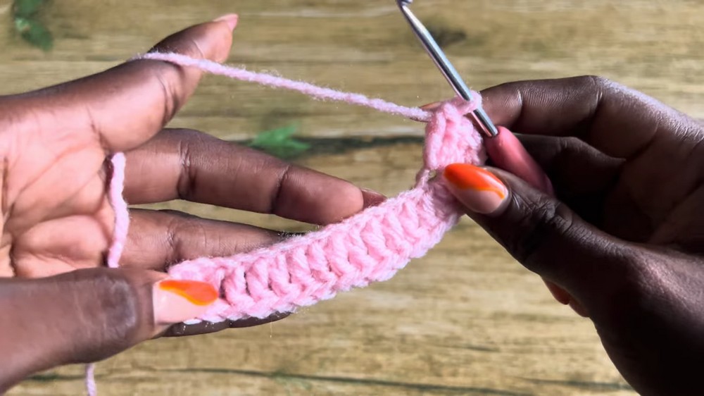 2. Start with double crochet stitches by working into the 4th chain from the hook. Continue double crocheting all the way across the foundation chain.