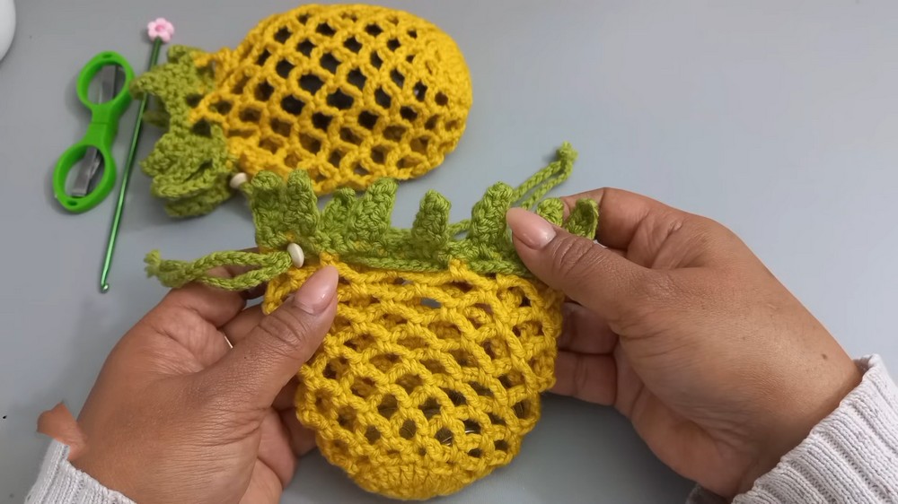 Your crochet bag is complete! This piña inspired design is both functional and visually appealing, perfect for storing headphones, coins, wipes, or even as a small accessory pouch. The leaf detail gives it a tropical charm, while the spiraling waves create a sturdy yet elegant shape.