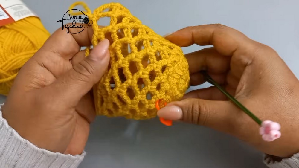 - Create 12 pillars using the “2 sacaditas” technique (double crochet with two pulls to reduce looseness).