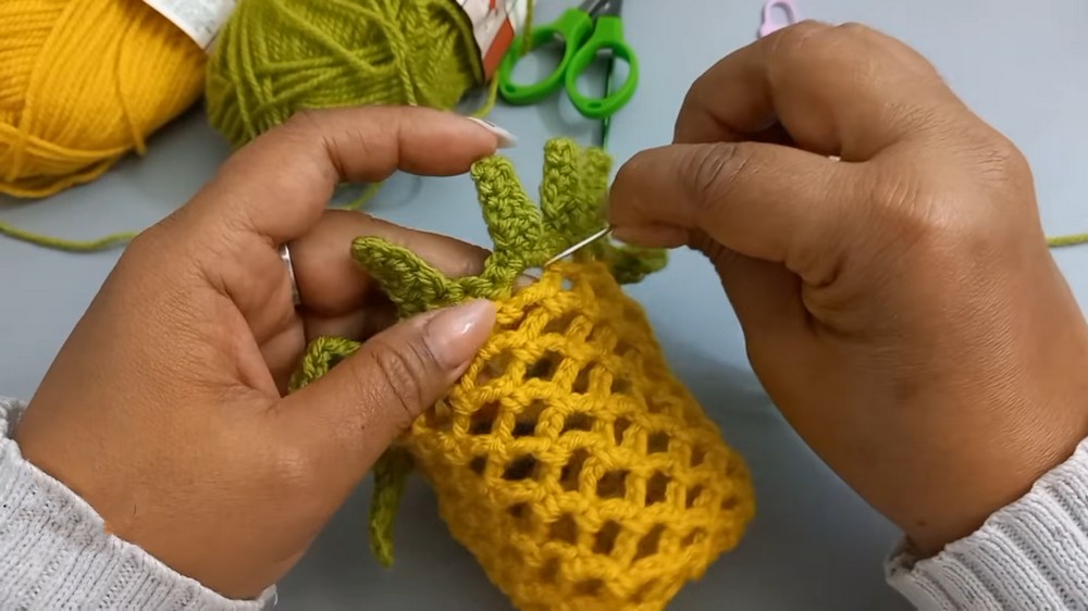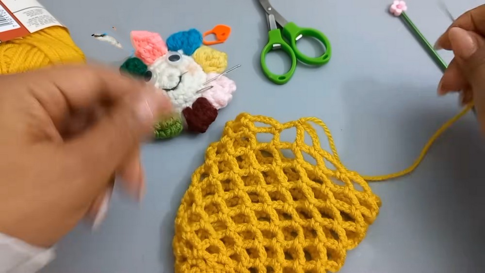 - Connect the green yarn at the bag’s top edge. Make sure to leave a long tail for weaving later.