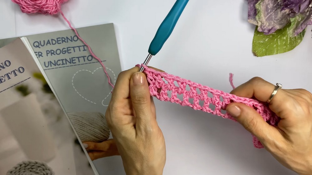 • [CH 4, skip 3 stitches, SC into the next stitch] across the row.